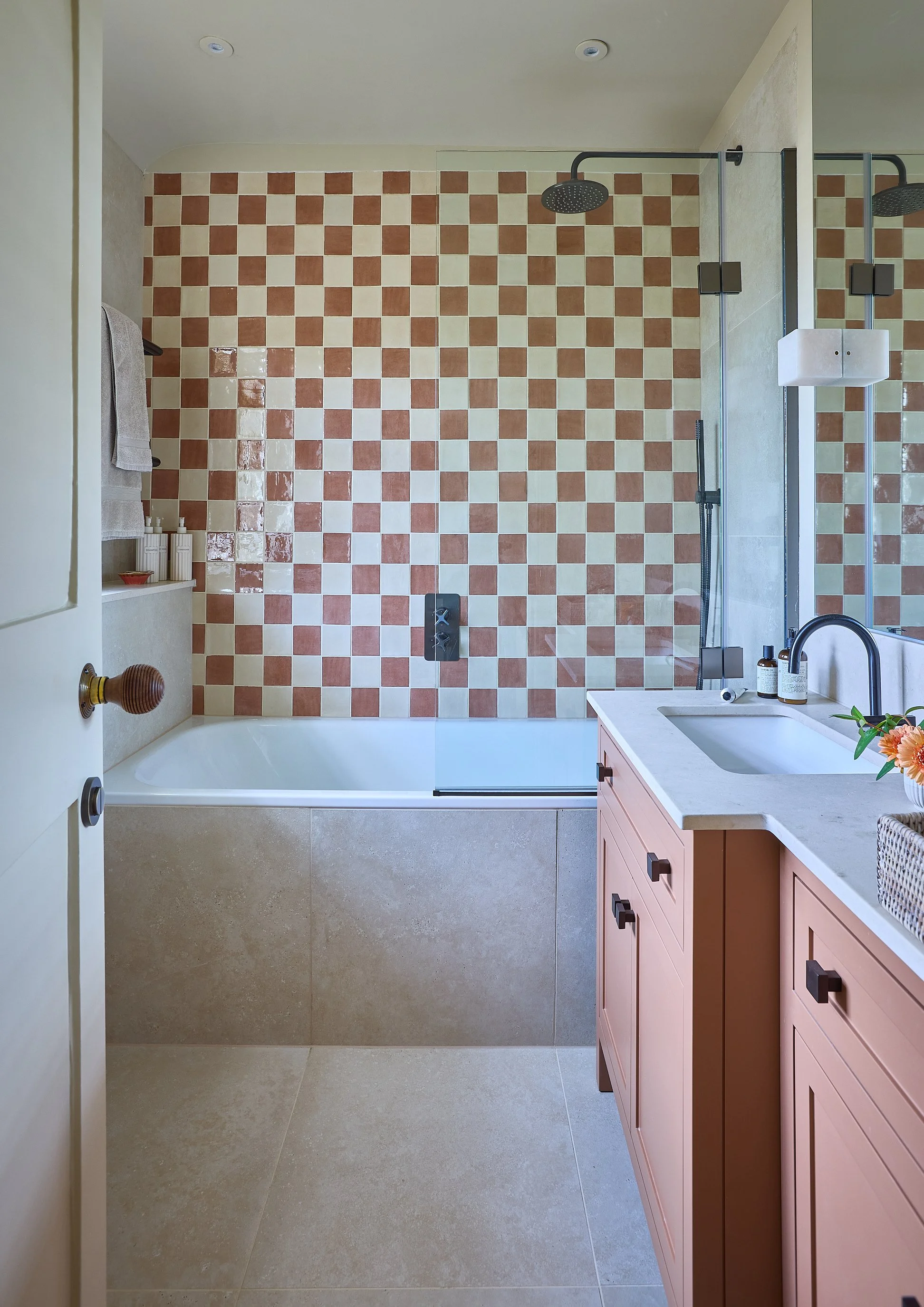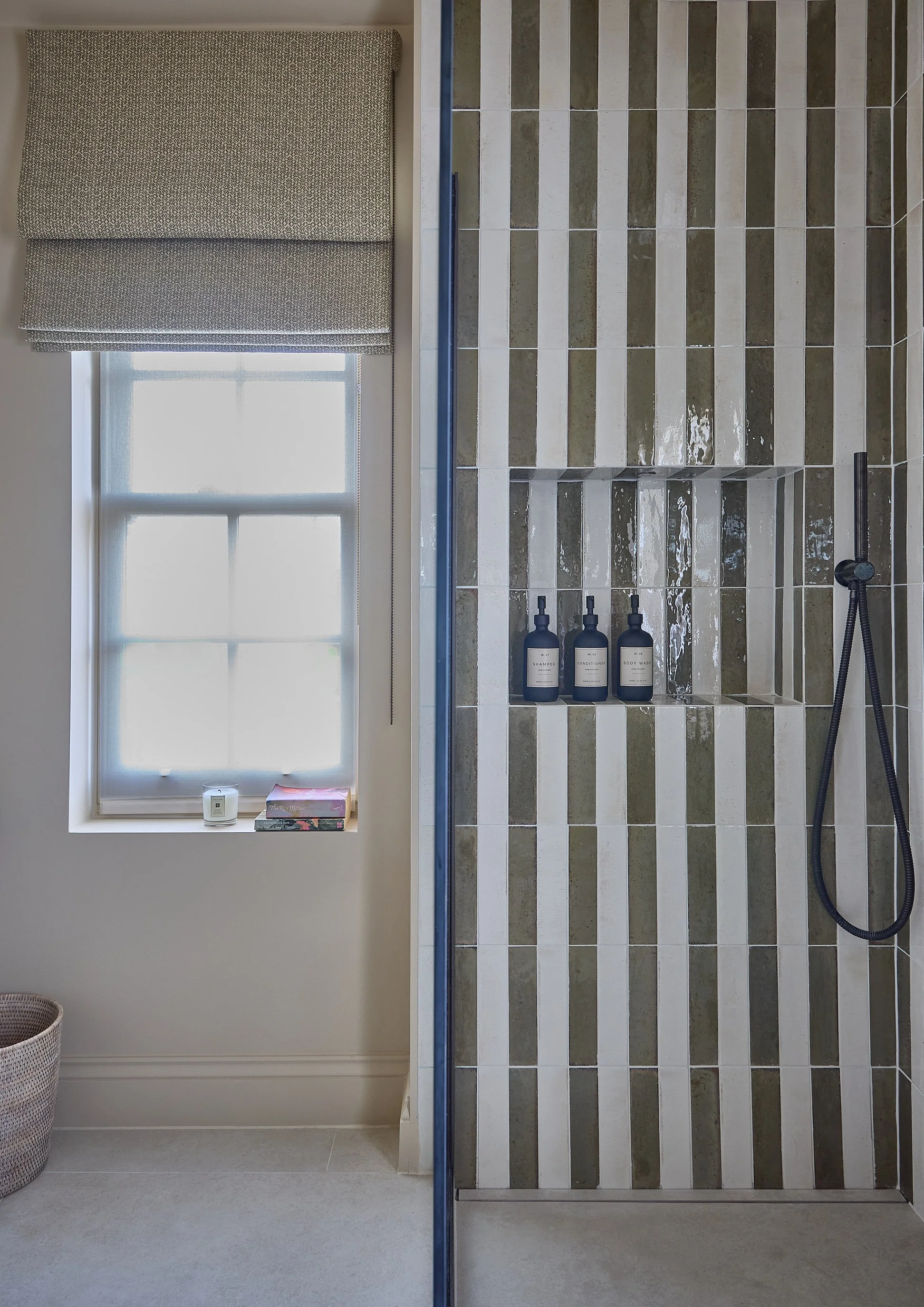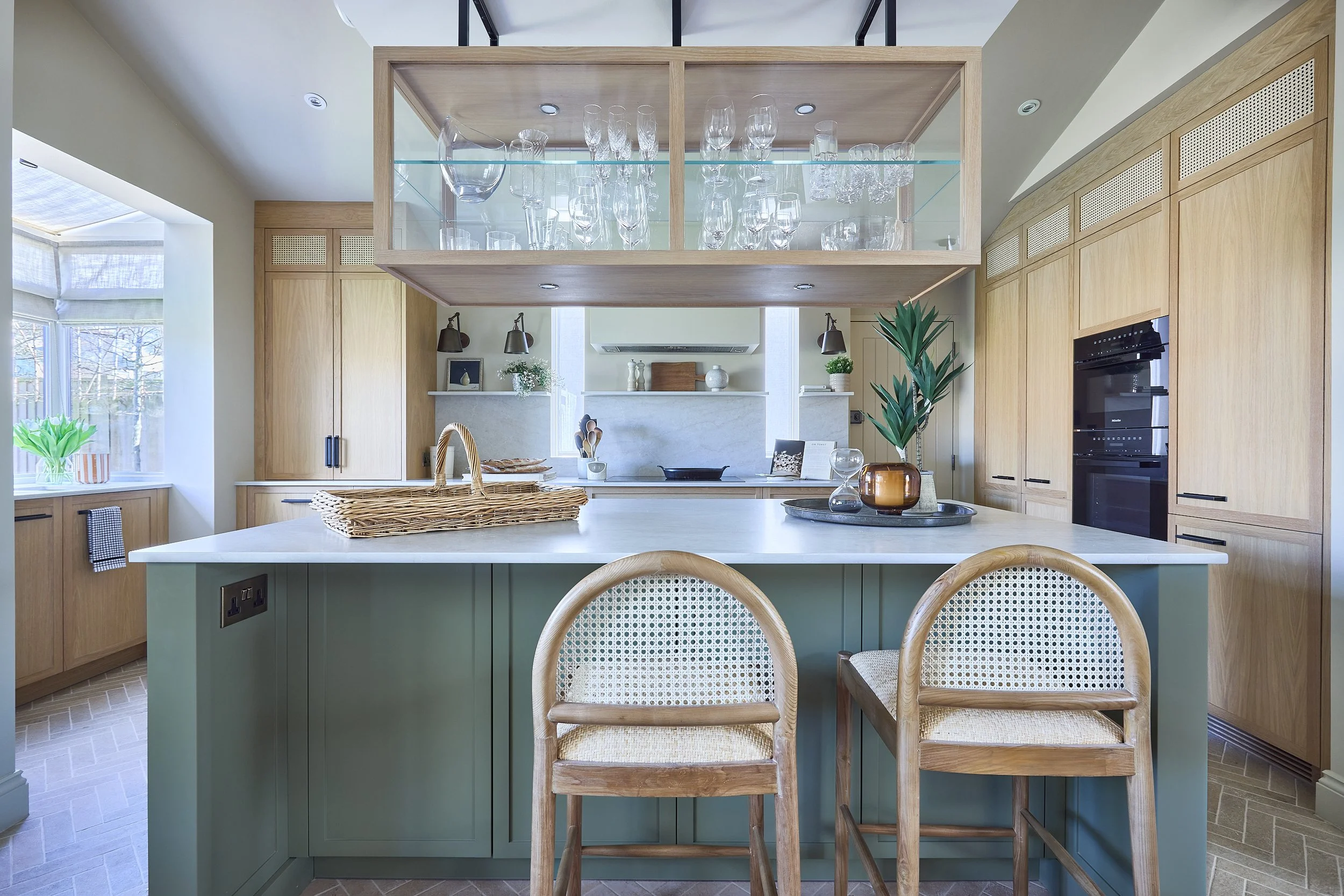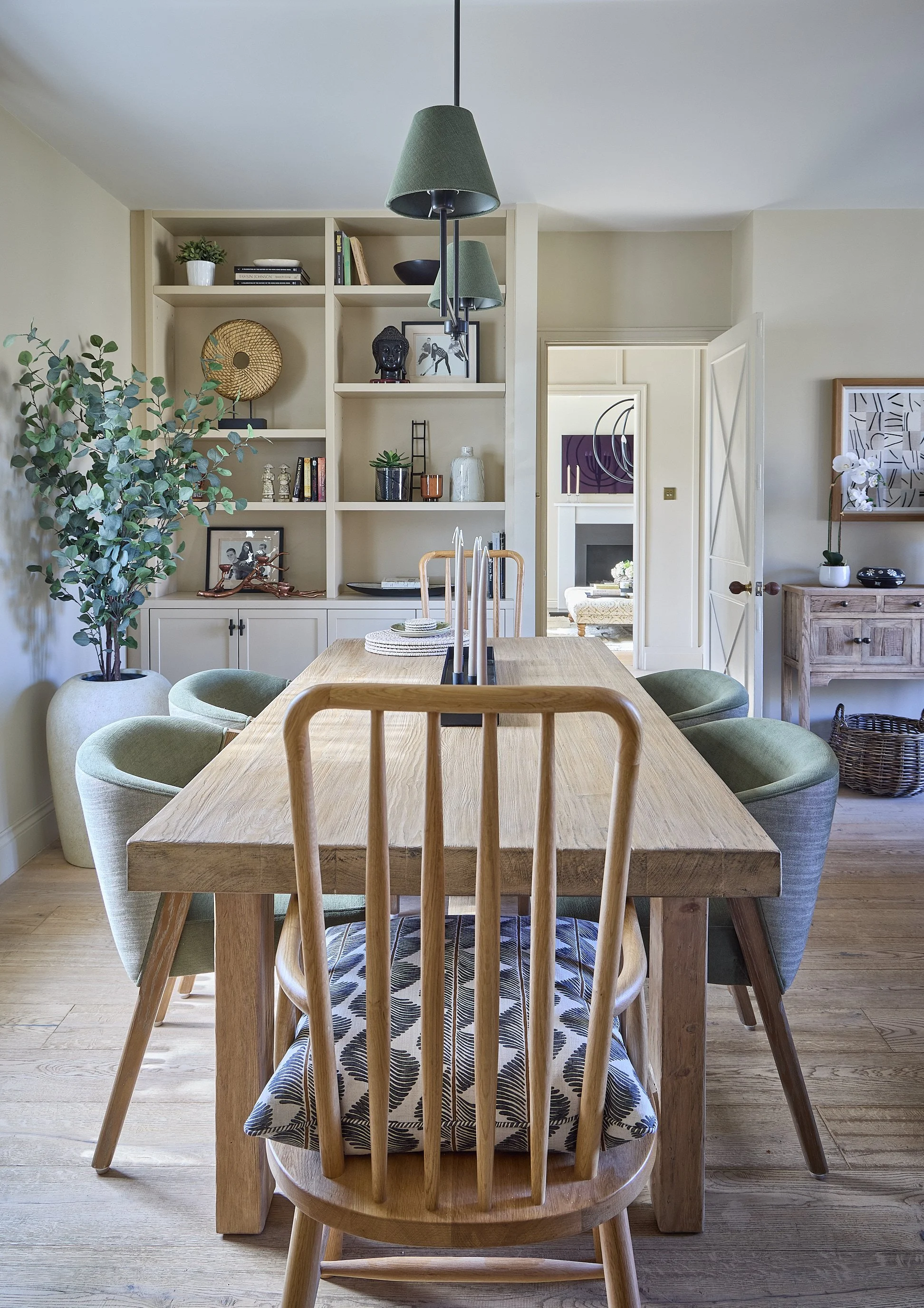 Opening up the kitchen, snug, and dining areas with removal of a large floor to ceiling dividing wall improved flow and light this large ground floor area. A large island unit and bespoke hanging wood framed glass cabinet maintained subtle separation, whilst allowing light to flow through the entire space. Originally a four bedroom, one bathroom home, the firstt floor study was converted into a principal en-suite shower suite, to better support modern living, and to create a calm, private en-suite sanctuary for the client.